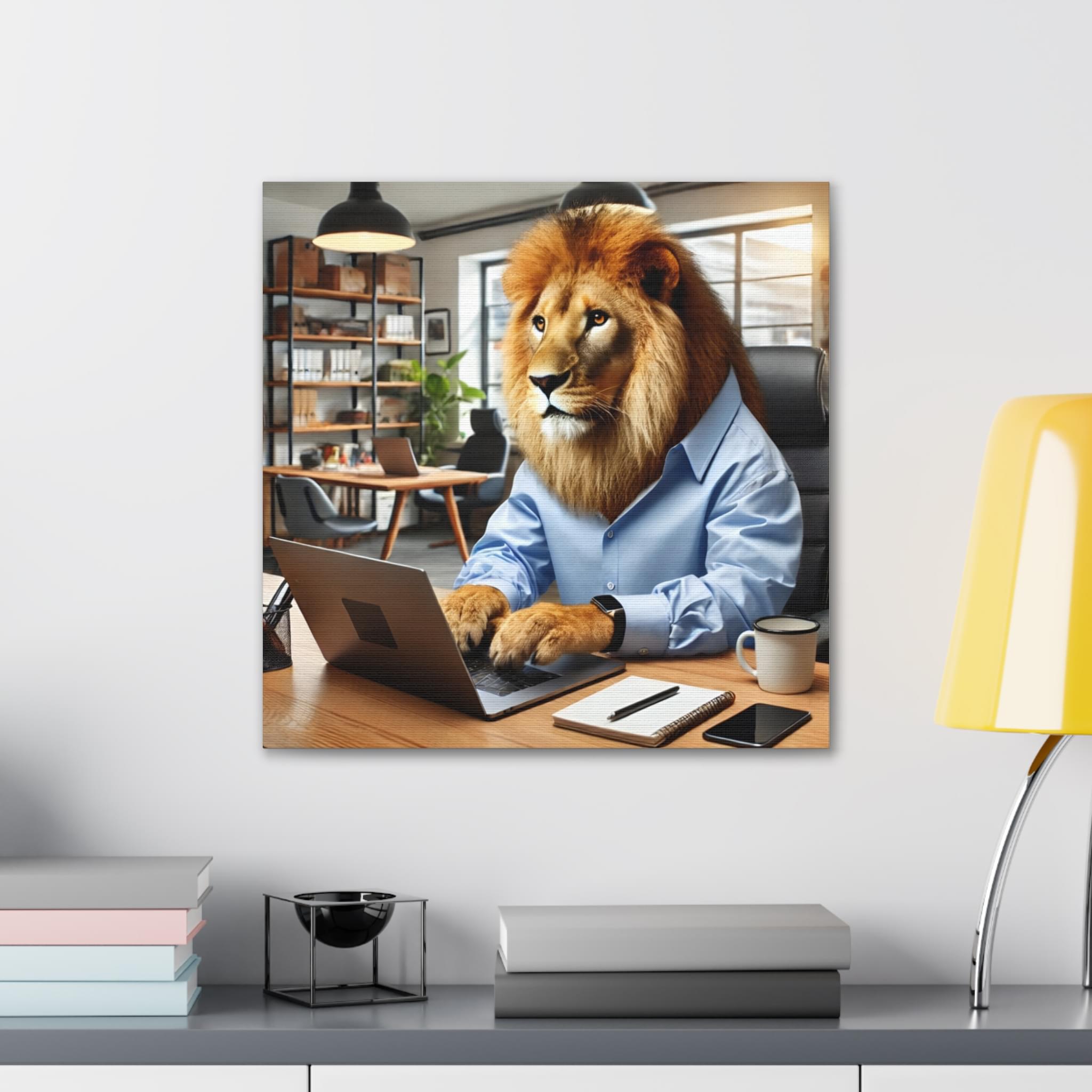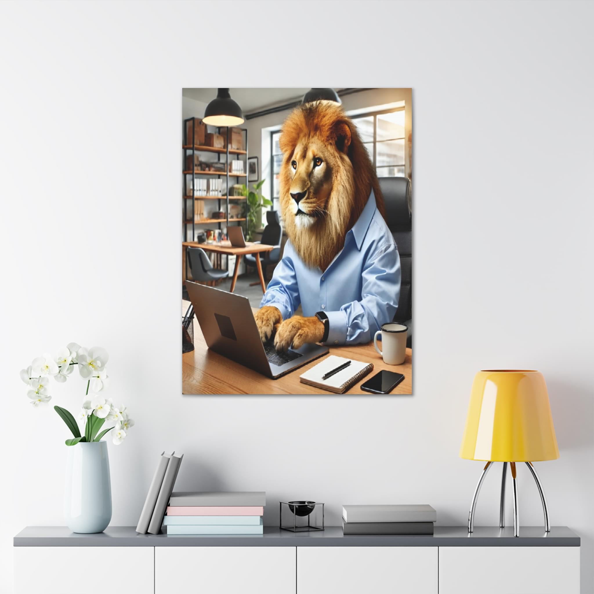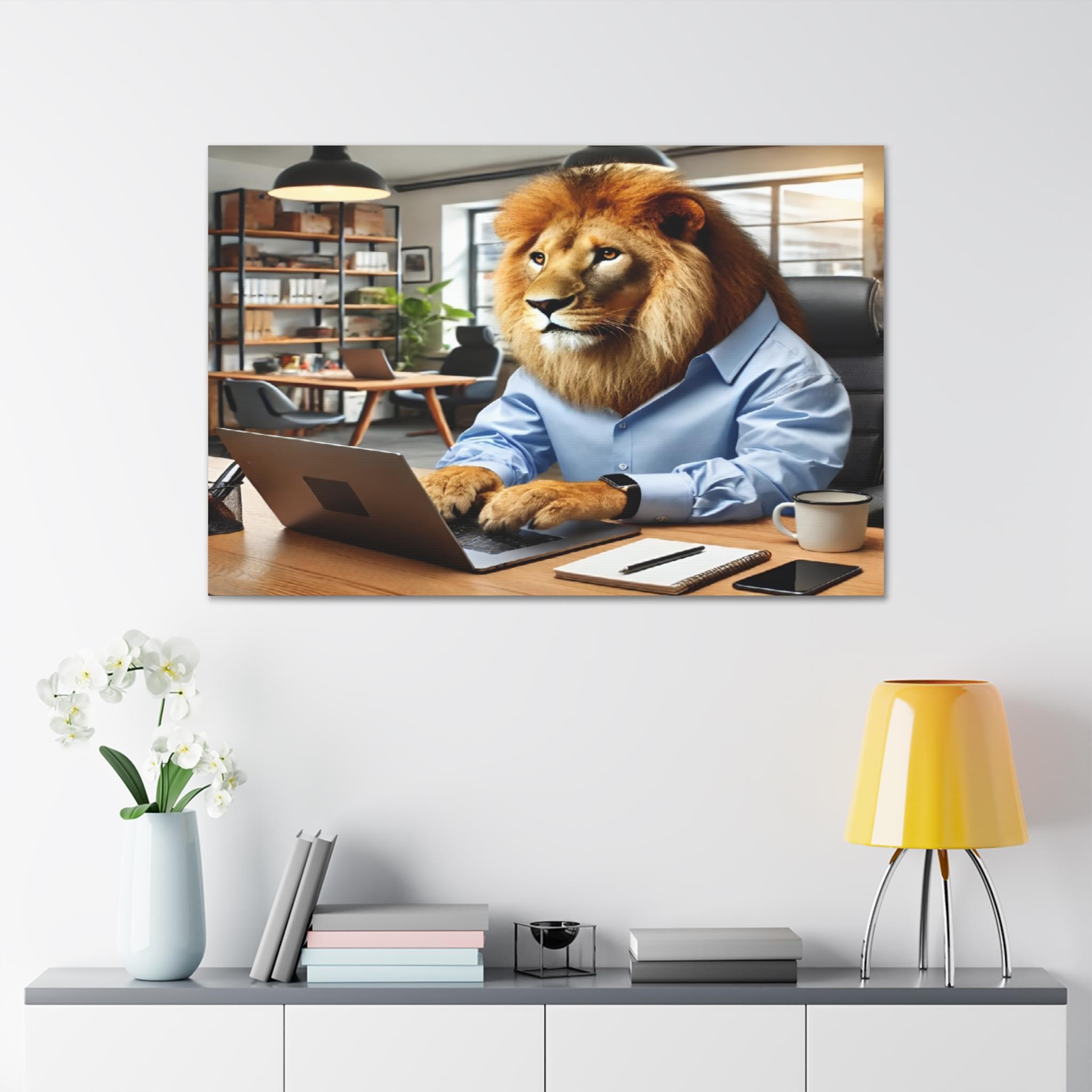 Elevate your space with this striking printable wall art featuring a lion confidently operating a laptop while dressed in a stylish human shirt, set in a classic office. This artwork is a perfect addition to any environment—be it your home, office, or any area craving a splash of creativity. With its modern, high-resolution design, this instant digital download is not just a decoration; it’s a statement piece that will enhance your surroundings and add flair to your digital devices. Transform your space today with this unique artwork!