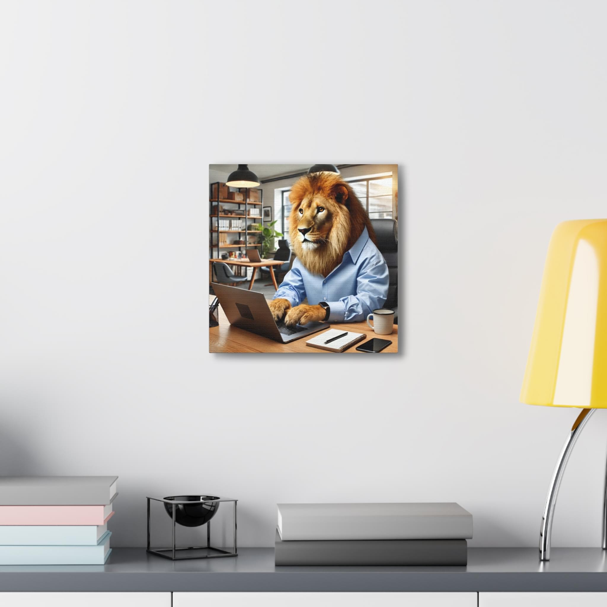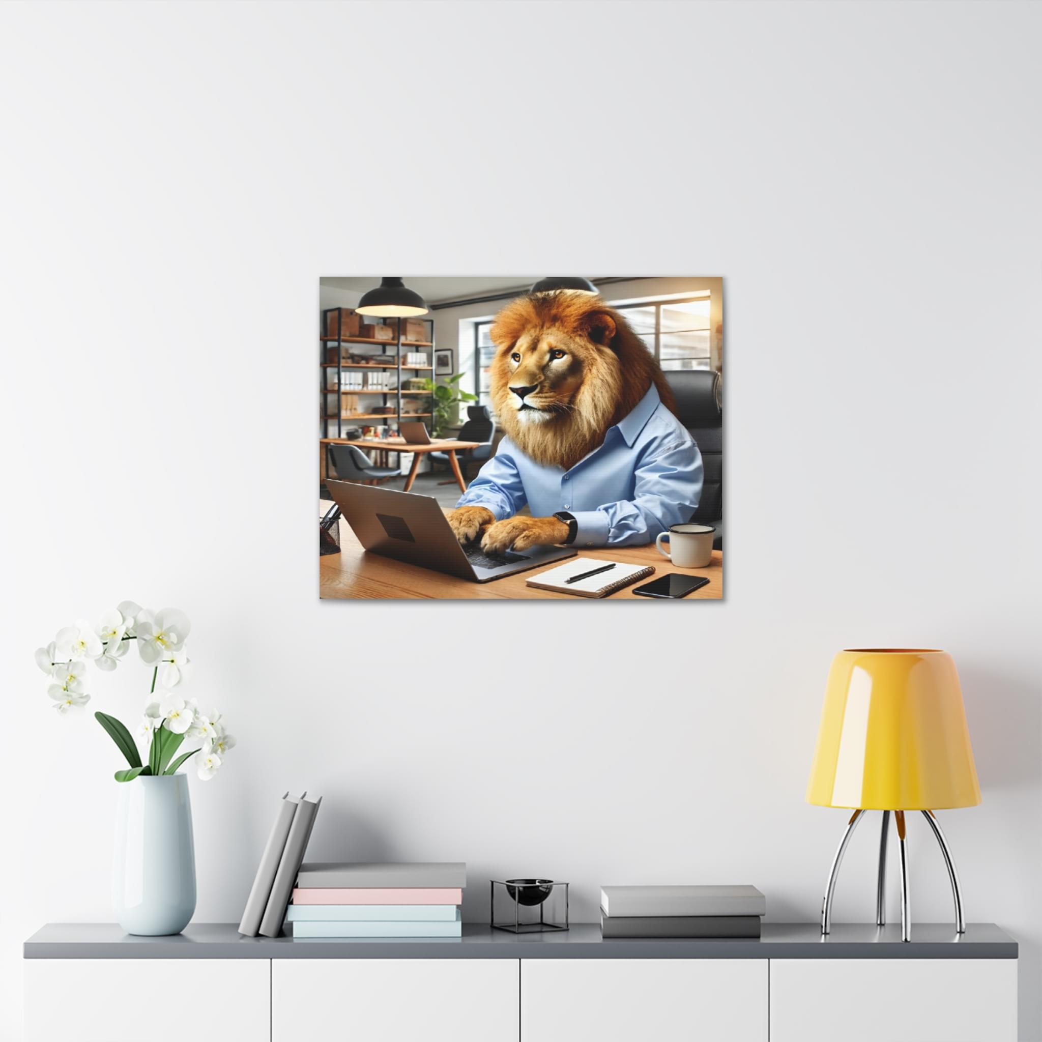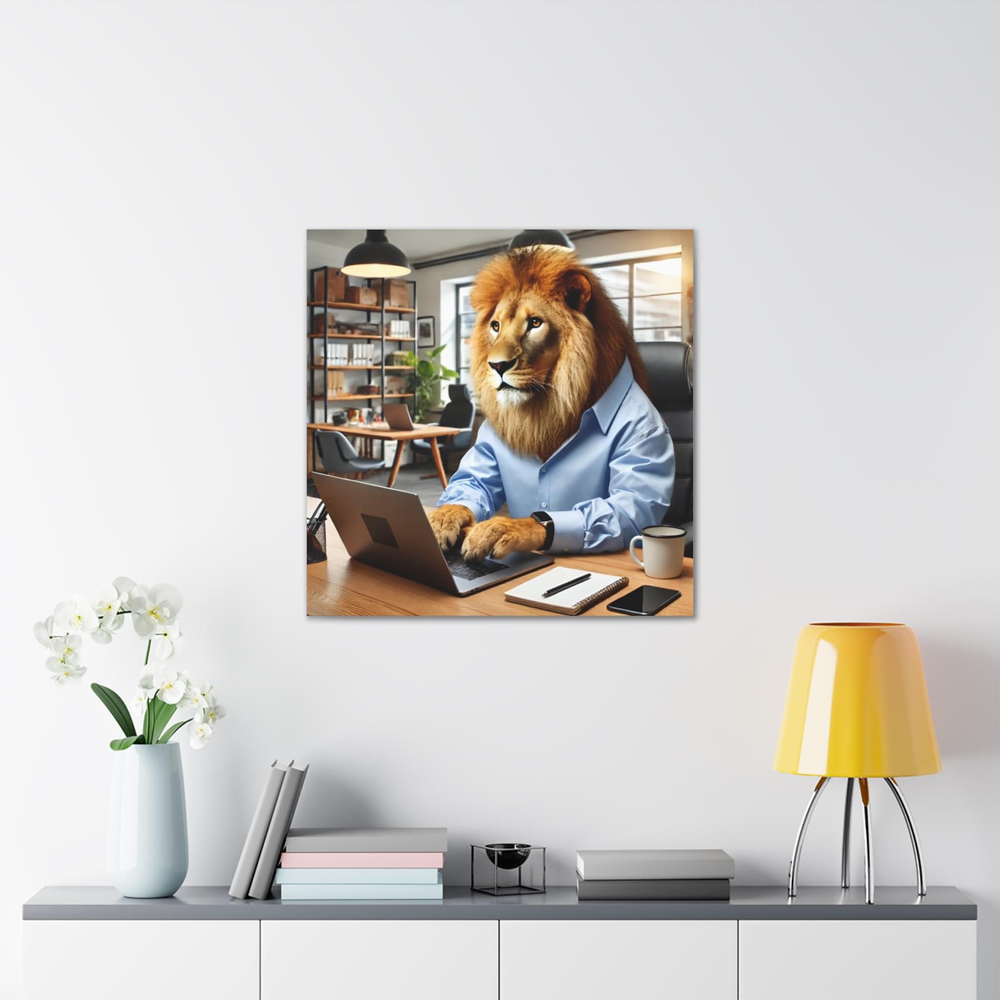 Elevate your space with this striking printable wall art featuring a lion confidently operating a laptop while dressed in a stylish human shirt, set in a classic office. This artwork is a perfect addition to any environment—be it your home, office, or any area craving a splash of creativity. With its modern, high-resolution design, this instant digital download is not just a decoration; it’s a statement piece that will enhance your surroundings and add flair to your digital devices. Transform your space today with this unique artwork!